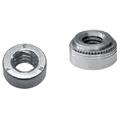 Self-clinching nuts are installed by placing them in properly sized holes in sheets and applying a parallel squeezing force to the head of the nut. The sheet metal surrounding the head cold flows into an undercut thereby making the fastener an integral part of the sheet. More... A serrated clinching ring prevents the fastener from rotating after installation. Provide load-bearing threads in thin sheets with high pushout and torque-out resistance.Type CLA is recommended for use in steel or aluminum sheets HRB (Rockwell "B" scale) 50 or less and HB (Hardness Brinell) 82 or less.Types CLS / CLSS are recommended for use in steel or aluminum sheets HRB (Rockwell "B" scale) 70 or less and HB (Hardness Brinell) 125 or less.Types S / SS are recommended for use in steel or aluminum sheets HRB (Rockwell "B" scale) 80 or less and HB (Hardness Brinell) 150 or less.Type SP is recommended for use in stainless steel sheets HRB (Rockwell "B" scale) 90 or less and HB (Hardness Brinell) 185 or less. Less