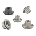 Self-clinching nuts are installed by placing them in properly sized holes in sheets and applying a parallelsqueezing force to the head of the nut. The sheet metal surrounding the head cold flows into an undercut therebymaking the fastener an integral part of the sheet. More... A serrated clinching ring prevents the fastener from rotating afterinstallation.Type S, SS, CLS, and CLSS nuts provide load-bearing threads in thin sheets with highpushout and torque-out resistance.Type SP, PEM 300® nuts provide strong load-bearing threads in stainless steel sheetsas thin as .030”. Less