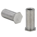PEM® self-clinching studs are installed by placing them in properly sized holes in the sheets and squeezing into place with any standard press. The squeezing action embeds the head of the stud into the sheet. The metal displaced by the head flows smoothly and evenly More... around the ribs and into the annular groove – creating a flushhead assembly and securely locking the stud into the sheet with high torque-out and pushout resistances.TP4 Pilot Pins satisfy a wide range of positioning, pivot, and alignment applications. The chamfered end makes mating hole location easyFlush-head for sheet thickness of .040” and greater.Satisfies a wide range of positioning, pivot, and alignment applications.Chamfered end makes mating hole location easy.Type TP4 recommended for use in stainless steel sheets HRB (Rockwell “B” Scale) 92 or less and HB (Hardness Brinell) 195 or less. Less